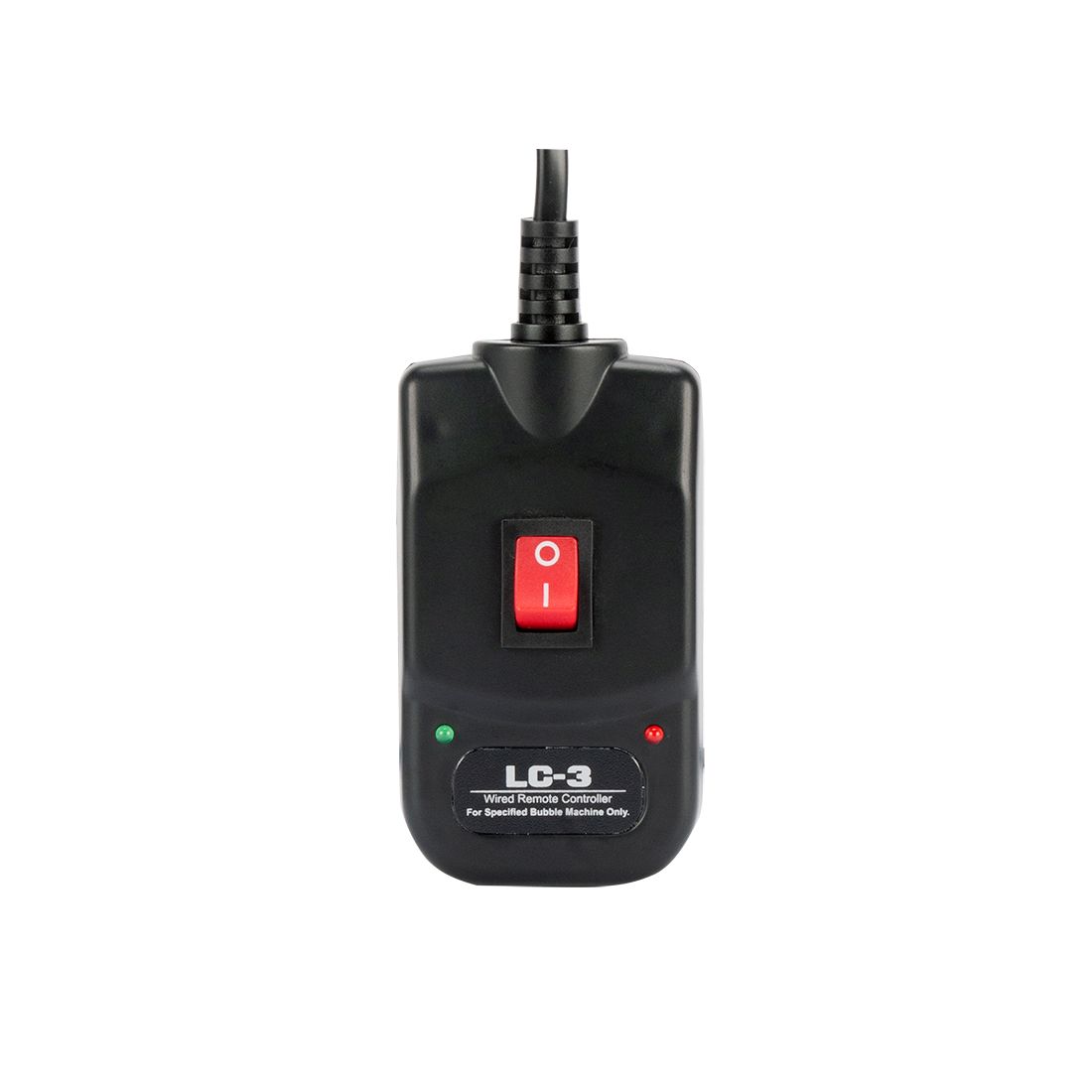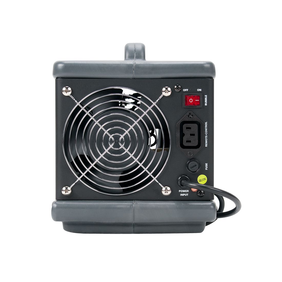 Featuring an intuitive ON/OFF switch on the rear and a convenient wired remote with a 7.6m (25 ft.) cable, it's incredibly user-friendly. The durable plastic casing, large high-velocity fan, and carrying handle make it a robust companion. It accommodates most bubble liquids, consumes minimal power (24W), and has a fluid consumption rate of 1 liter every two hours (120V: 20 ml/min, 230V: 11 ml/min).