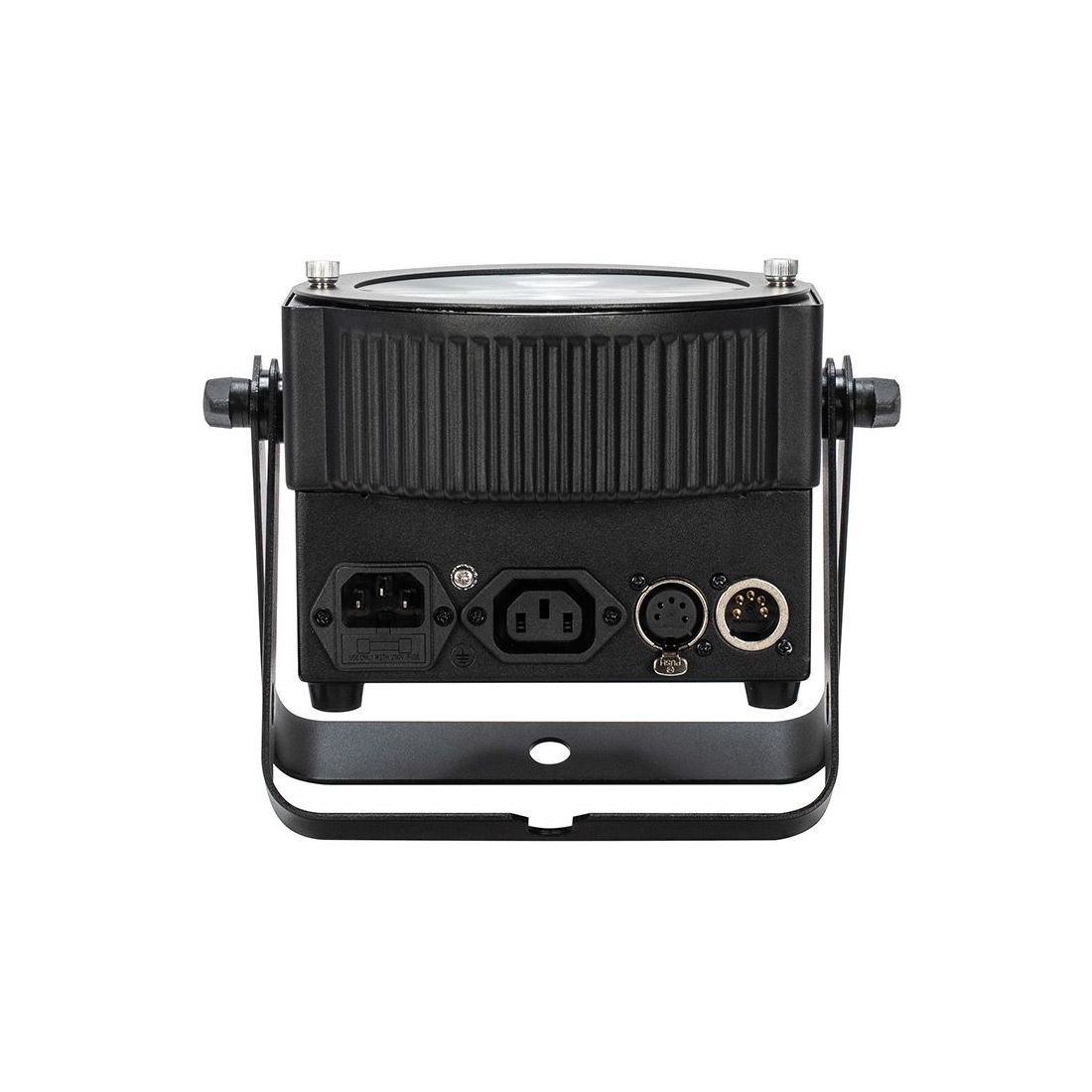 The fixture has locking power in and out sockets to daisy chain power, plus 5-pin DMX in/out sockets. The supplied scissor yoke allows for flexible use allowing the fixture to be hung in the air or set on the ground.