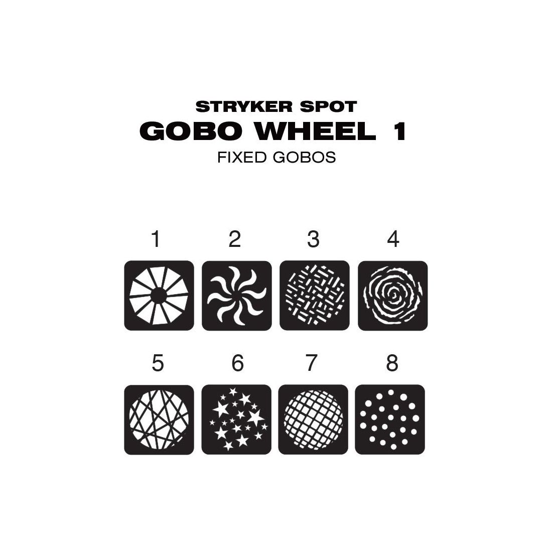 At the heart of the Stryker Spot is a potent 150-Watt cool white LED engine, which offers an average life expectancy of 50,000 hours. Its light output is channeled via high quality optics through a variety of beam shaping tools and out from a 60mm glass front lens. It features 8 fixed static and 6 replaceable rotating GOBOs, on independent wheels, alongside a separate 7-slot color wheel. There are also two rotating prisms (5-facet linear and 6-facet circular), while motorized zoom provides a variable beam angle of 9° - 14° and motorized focus allows sharp pattern projections over varying distances. The fixture offers pan and tilt ranges of 540° and 210°, respectively, while 16-bit fine control allows for smooth movement as well as precise positioning.