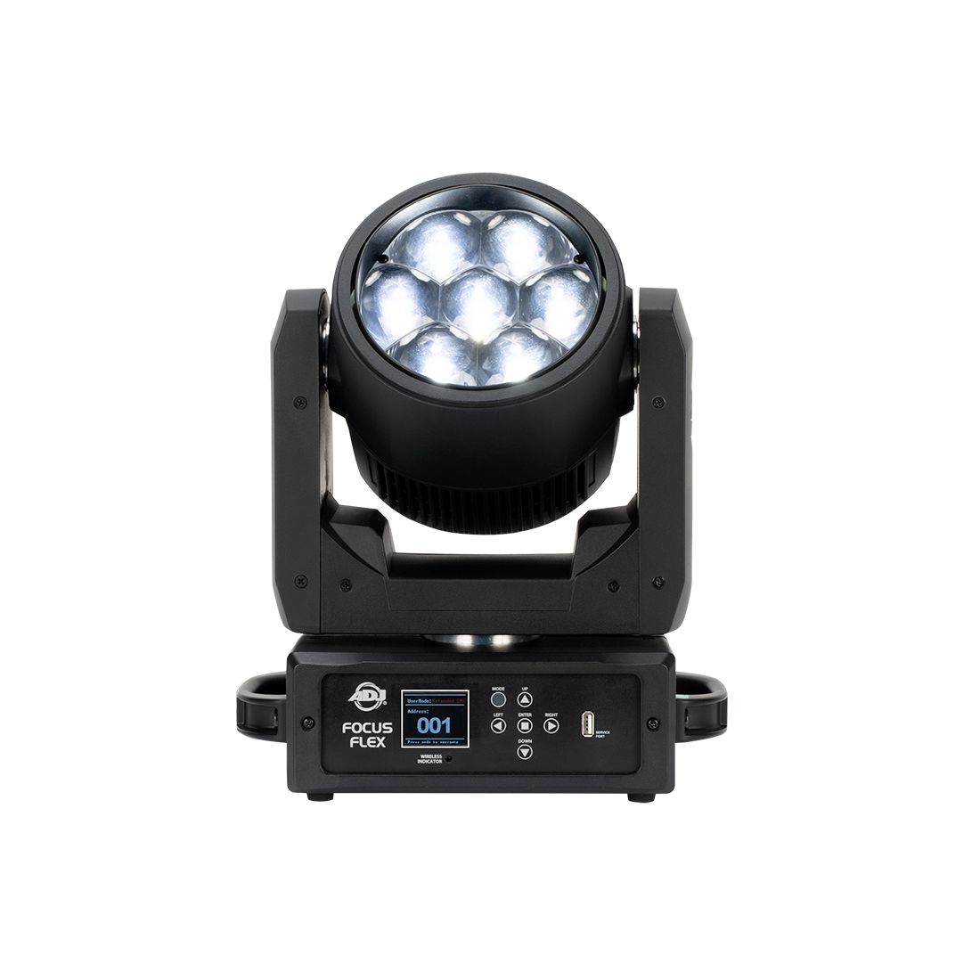 A flexible fixture, the Focus Flex offers a range of DMX mode options [7 DMX Modes - 16/25/34/42/50/25 (CMY)/28 (CMY) Channels], appropriate to different applications, as well as a variety of customizable options, including selectable LED refresh rate and dimming modes. These are accessed through a color LCD display panel with 6-button menu interface located on the side panel of the fixture alongside a USB port which can be utilized for easy updates of future firmware releases.
